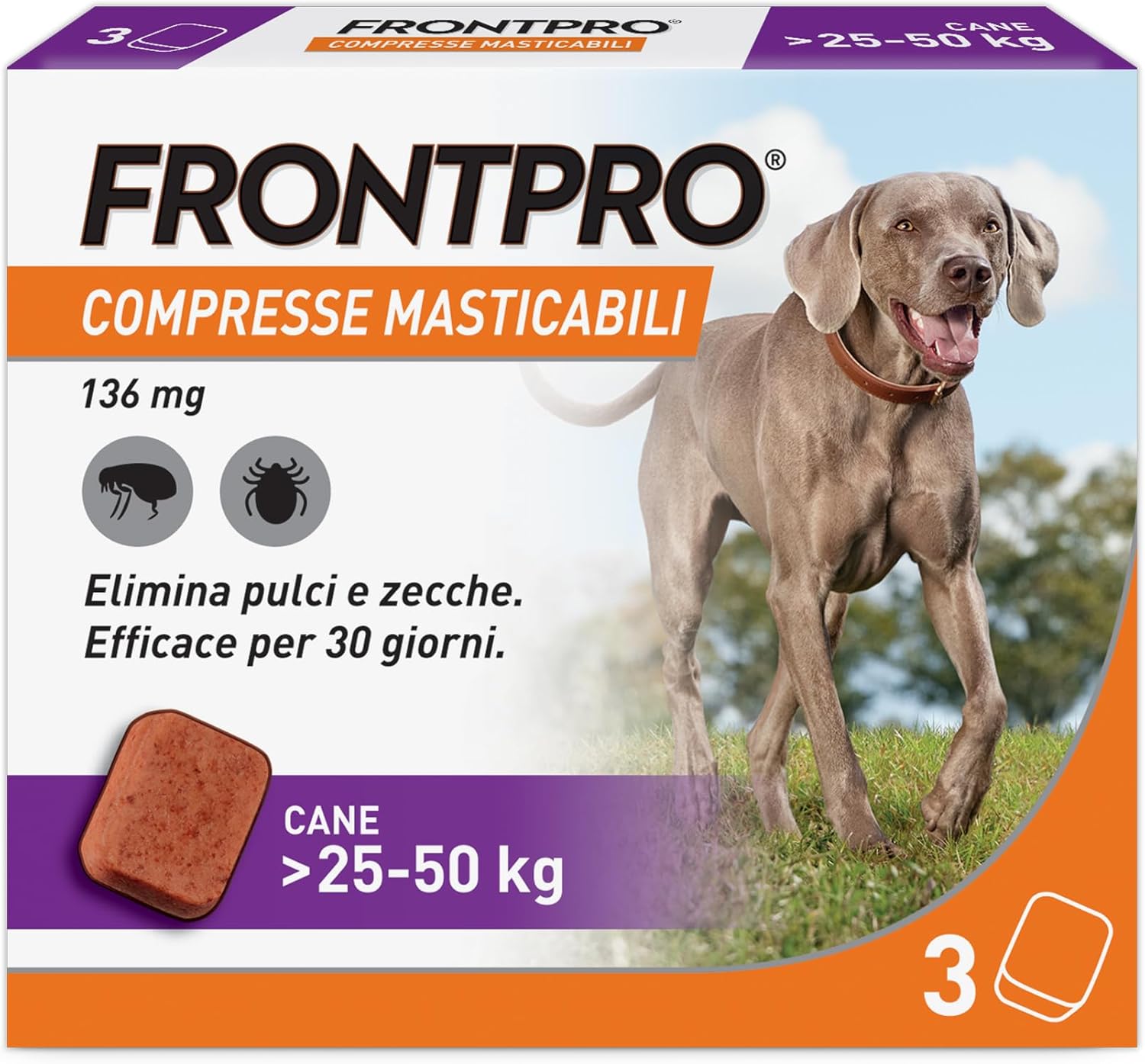 La confezione include 3 compresse masticabili da 136 mg, pensate per cani di taglia grande o gigante con peso compreso tra 25 e 50 kg, con protezione fino a 30 giorni per ogni compressa.